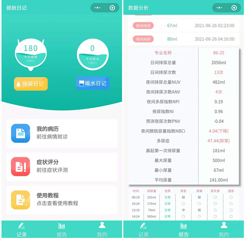 同时患者可以在免费的膀胱日记小程序中进行间质性膀胱炎的症状评分和生活质量评分,以便帮助医生了解你的病情程度,在膀胱日记中进行排尿日记和饮水日记的记录,一般连续记录三天,膀胱日记小程序会自动根据您的记录进行计算和评估膀胱功能。
