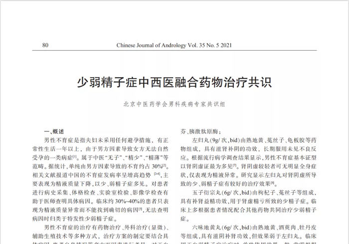 为了使少弱精子症的诊断和治疗更加科学、规范、合理,北京中医药协会男性疾病专家共识组通过德尔菲法收集问卷,结合临床实践和专家经验,梳理中西医结合下少弱精子症的诊疗思路,发起制定了《少弱精子症中西医结合药物治疗共识》。
