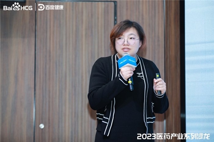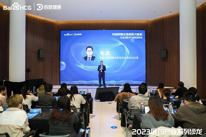 百度健康药企营销总经理毛及出席现场致辞,百度大健康事业群商业产品部产品负责人刘玉清、百度创新业务负责人吴婷婷分别就医疗行业AI原生应用及AI全场景赋能医疗营销进行内容分享。
