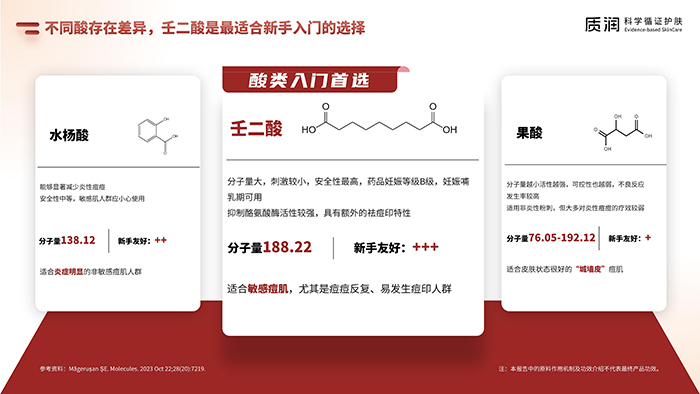 消费者对祛痘产品的选择越来越倾向于科学、有效且温和的产品。其中,水杨酸的使用率达到了70%,但其对敏感肌肤的适用性存在局限。相比之下,壬二酸以其抗炎、抗菌、抗角化等多重功效,以及对敏感肌肤的友好性,逐渐成为消费者的新宠。
