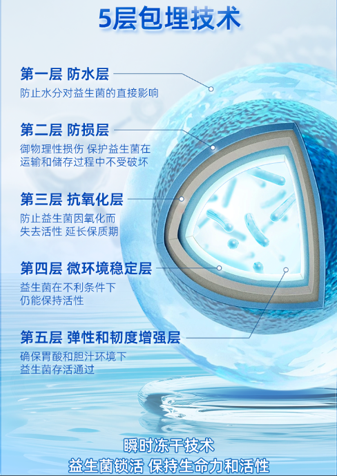 面对人体复杂且充满挑战的环境,尤其是胃酸和胆汁等强大的消化液,益生菌如何安全抵达肠道并发挥其应有功效,一直是行业关注的焦点。禾优健猴头菇即食12株益生菌创新性地采用了五层包埋技术,这一技术如同一件精心打造的“隐形盔甲”,层层保护益生菌免受外界侵害。从防水层到抗氧化层,再到微环境稳定层,每一层都经过精心设计,旨在确保益生菌在穿越胃酸、胆汁等“艰难险阻”时依然保持高活性。而最后的弹性和韧度增强层,更是为益生菌提供了额外的保护,确保它们能够顺利抵达肠道,发挥调节肠道菌群、促进消化吸收等重要作用。