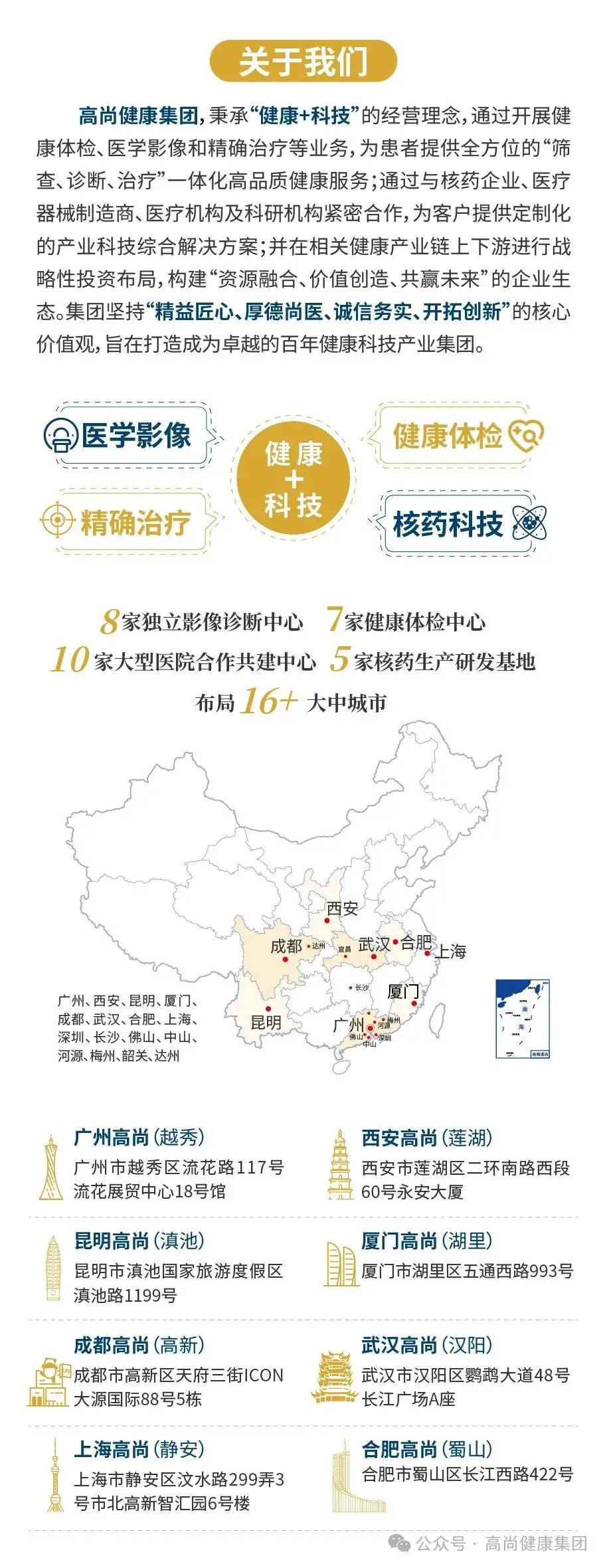 高尚健康集团成立于2003年,是一家在核医学及第三方影像诊断领域具有广泛影响力的医疗产业集团。在国内PET/CT起步之初,高尚健康集团便与多家大型医院共建PET/CT中心,成为国内早期开展PET/CT技术的企业之一。高尚健康集团秉承“健康+科技”的经营理念,通过开展健康体检、医学影像和放射治疗等业务,为患者提供全方位的“筛查、诊断、治疗”一体化高品质健康服务;通过与核药企业、医疗器械制造商、医疗机构及科研机构紧密合作,为客户提供定制化的产业科技综合解决方案;在相关健康产业链上下游进行战略性投资布局,构建“资源融合、价值创造、共赢未来”的企业生态。目前已经建立8家独立影像诊断中心、7家健康体检中心、10家大型医院合作共建中心、5家核药生产研发基地,带着“深耕”精神,布局16+大中城市,积极推动国家分级诊疗发展。