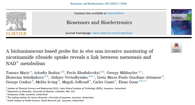 [3] Maric T, Bazhin A, Khodakivskyi P, Mikhaylov G, Solodnikova E, Yevtodiyenko A, Giordano Attianese GMP, Coukos G, Irving M, Joffraud M, Cantó C, Goun E. A bioluminescent-based probe for in vivo non-invasive monitoring of nicotinamide riboside uptake reveals a link between metastasis and NAD+ metabolism. Biosens Bioelectron. 2023 Jan 15;220: 114826. doi: 10.1016/j.bios.2022.114826. Epub 2022 Oct 29. PMID: 36371959.