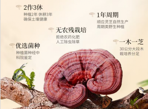靠山庄来自吉林蛟河山区,原料灵芝在富硒黑土中生长。采用冷风对撞破壁工艺,破壁率99%。三萜含量16.5克,多糖2.1克。