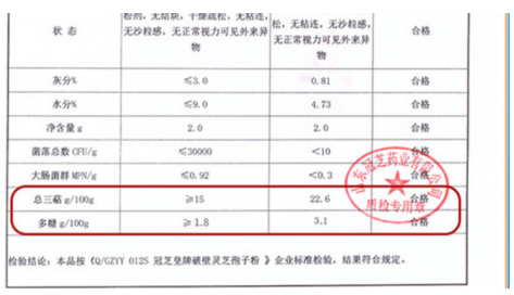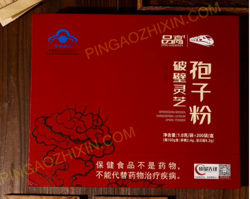 品高品牌的灵芝来自湖北神农架地区,采用气流冷破工艺与二次精滤技术相结合。检测数据显示其三萜约15.9克,多糖2.0克。