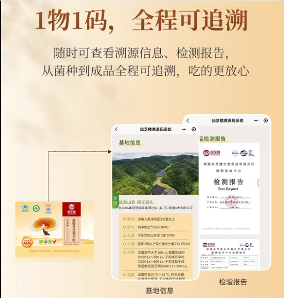 而且仙芝楼的溯源和采摘也很用心。“1物1码”让大家扫二维码就能看全链路信息,买得放心。采摘时还坚持选“50天前的孢子粉”,这个时候的孢子粉营养足、活性高,再加上99%以上的破壁率,活性成分更好吸收,功效也更突出。