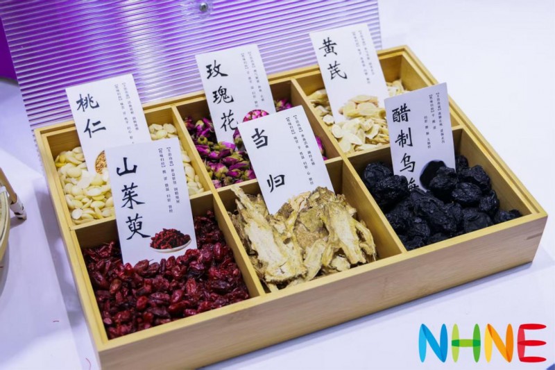 在展位中央的 “道地药材展示区”,一组透明六宫格展柜格外引人注目——每个展格内都整齐摆放着一种药食同源膏方道地原材,搭配清晰的文字说明,详细介绍原料的性味归经、主治功效及在膏方中的作用。展柜内,产自甘肃的黄芪质地柔韧、色泽黄亮,来自宁夏的枸杞颗粒饱满、果肉厚实,东阿阿胶块质地细腻、断面光亮,还有当归、天麻、佛手、桃仁、百合、桑椹等十余种优质药材,均经过九楚膏滋原料筛选团队的层层把关。
