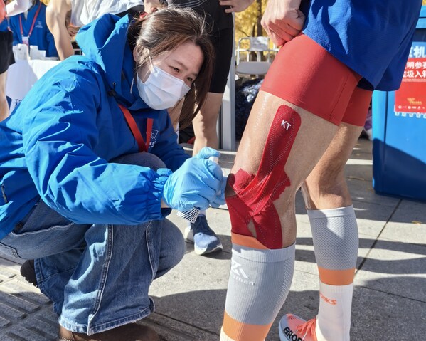 有个不易察觉的细节是,他的大拇指和食指都事先贴着创可贴:"这么做是防止在操作中产生摩擦损伤,也是为了不耽误任何一秒钟的救治时间,更好地服务跑者。"