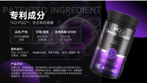 配方组合:核心成分为专利复合物 KOXpqq 与复合脑靶向提取物 KOXbrain。后者融合了磷脂酰丝氨酸(PS)、亚精胺、酸枣仁提取物等成分。其中,PS 在部分研究中被提及与大脑相关生理机能存在关联。