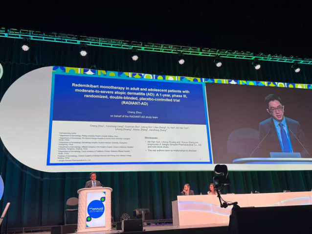 随着精准医学时代的到来,生物靶向药物的崛起为破局带来了曙光。2026 年 3 月 28 日,第 84 届美国皮肤科学会年会 (AAD) 在美国科罗拉多州丹佛市召开。作为全球皮肤病学领域的学术盛会,本次大会见证了重要一刻:北京大学人民医院皮肤科主任周城教授在大会现场对创新抗体药物 —— 乐德奇拜单抗的 Ⅲ 期临床研究结果进行口头报告。结果显示,跟安慰剂组对比下,乐德奇拜单抗的研究结果表现出安全、有效、整体耐受性良好的结果。该研究由北京大学人民医院张建中教授和周城教授联合牵头担任主要研究者,共有 59 家医院参与。这一成果作为最新突破性摘要 (Late-Breaking Research) 在现场公布,为中重度 AD 的长期管理开启了全新的篇章。(乐德奇拜单抗是先声药业与康乃德生物医药合作的创新抗体药物,此次公布的是其在成人及青少年中重度特应性皮炎患者中开展的 Ⅲ 期临床研究数据)