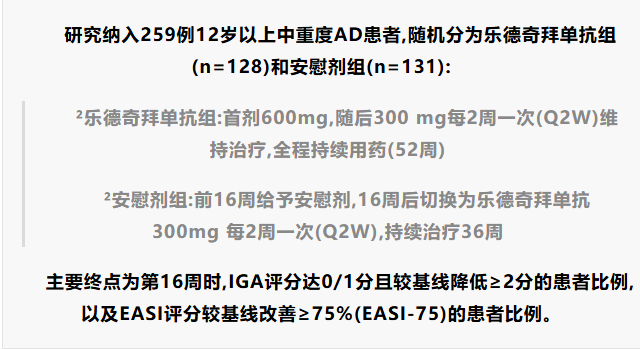 关键性 Ⅲ 期临床研究 (RADIANT-AD) 进一步验证了乐德奇拜单抗在 12 岁及以上中重度 AD 患者中的疗效与安全性。数据显示,治疗第 16 周,乐德奇拜单抗组在皮损清除 (EASI-75) 与疾病控制 (IGA 0/1) 指标上均显著优于安慰剂组;至第 52 周,持续治疗组应答率进一步攀升,且安慰剂转换组在启用药物后亦获益,佐证了其起效、疗效持久的特点。安全性方面,乐德奇拜单抗治疗 16 周未发生药物相关严重不良事件,整体耐受性良好,并在此基础上使部分患者实现皮损接近完全清除成为可能。
