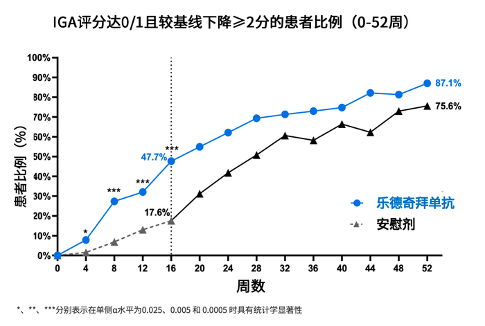 图 5 乐德奇拜单抗与安慰剂组第 16 周和 52 周 IGA 0/1 应答率